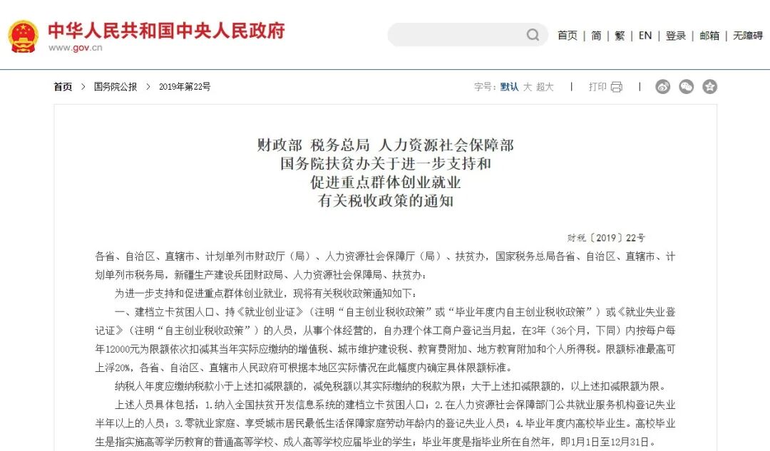 《關(guān)于進(jìn)一步支持和促進(jìn)重點(diǎn)群體創(chuàng)業(yè)就業(yè)有關(guān)稅收政策的通知》(財(cái)稅〔2019〕22號(hào))